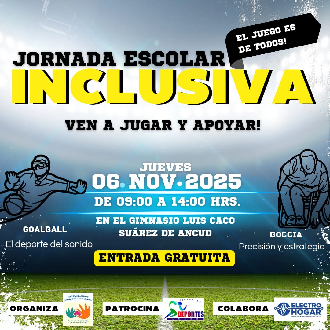 Eventos Deportivos ✅ Jornada Escolar Inclusiva – Jueves 06 Noviembre 2025 20/10/2025 3 Compartir Facebook Twitter WhatsApp Telegram Email Print 📍 Lugar: Gimnasio Fiscal «Luis Caco Suárez» 📅 Fecha: Jueves 06 Noviembre 2025.- 🕑 Hora: Desde las 09:00 a 14:00 hrs.- 💲 Valor: Entrada Gratuita.- Encuentro de GoalBall y Boccia.
