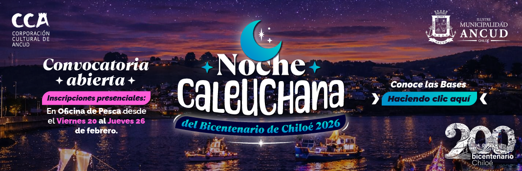 Inicio Portada CONCURSO DE EMBARCACIONES NOCHE CALEUCHANA 2026 CONCURSO DE EMBARCACIONES NOCHE CALEUCHANA 2026 20/02/2026 1808 Compartir Facebook Twitter WhatsApp Telegram Email Print Bases del Concurso de Embarcaciones Noche Caleuchana 2026 Últimas Noticias Alcalde de Ancud participó en comisión técnica del Puente Chacao 24/02/2026 Jornada de Integración e Historia en la Península de Lacuy Fortalece... 23/02/2026 Importante fiscalización refuerza la seguridad turística en Islotes de Puñihuil 18/02/2026 Avanza la Doble Vía en la Ruta 5 de Chiloé 16/02/2026 Concurso Público – Director o Directora Centros de Salud Familiar Ancud... 14/02/2026 Reforzarán las labores de fiscalización de la normativa vigente en materia... 13/02/2026 Chacao celebró sus 459 años destacando su historia y proyectando su... 12/02/2026