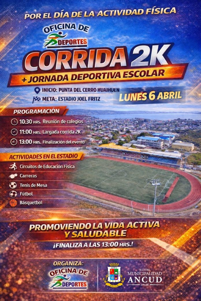 Eventos Deportivos CORRIDA DÍA DE LA ACTIVIDAD FÍSICA 2K – 06 ABRIL 10:30HRS 26/03/2026 10 Compartir Facebook Twitter WhatsApp Telegram Email Print 📍 Lugar y ruta: Desde Mirador del Cerro, hasta el estadio Joel Fritz. 📅 Fecha y hora: Lunes 06 de abril 2026, 10:30 hrs 💲 Valor Inscripción: GRATIS *En el estadio habrá estan deportivos e informativos.