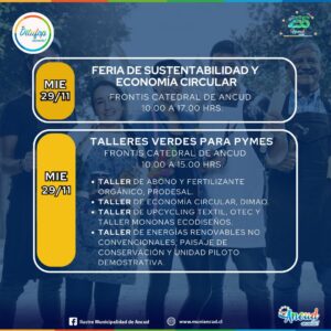 El calendario de la semana de la Pyme corresponde al día miércoles 29 con actividades de capacitación a cargo del programa Prodesal, de la Dirección de Medio Ambiente, Aseo y Ornato, en el Teatro Municipal Mauricio de la Parra; además de talleres de realización textil a cargo de la OTEC municipal y Mononas Ecodiseño Ancud.