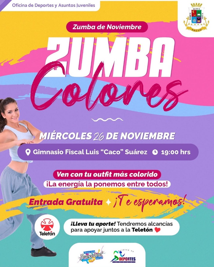 Eventos Deportivos ZUMBA MENSUAL – MIERCOLES 26 DE NOVIEMBRE 17/11/2025 7 Compartir Facebook Twitter WhatsApp Telegram Email Print 📍 Lugar: Gimnasio fiscal Luis Caco Suarez 📅 Fecha y hora: Miércoles 26 de noviembre, 19:00 hrs.- 💲 Valor Inscripción: GRATIS